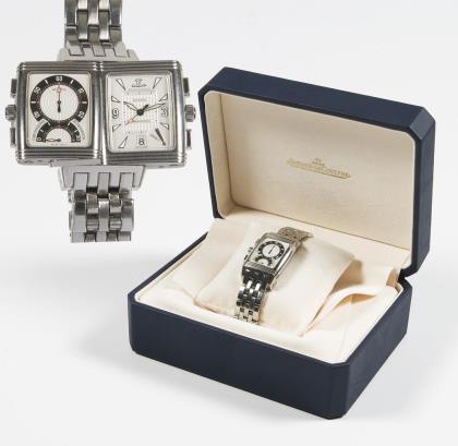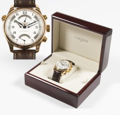 Automatikwerk, Kaliber L 698.2, water-resistant. Gehäuse mit verglastem Boden, silbernes Zifferblatt, gebläute Stahlzeiger, retrograde Anzeige (durch rückspringende Zeiger) von kleiner Sekunde, Wochentag, Datum und der Uhrzeit in einer zweiten Zeitzone. Original-Krokodil-Lederband mit Edelstahl-Doppelfaltschließe. Original-Box, Karton, broschürtes Handbuch mit Garantie-Karte und Bedienungsanleitung