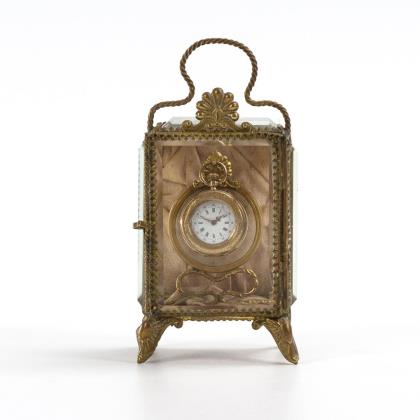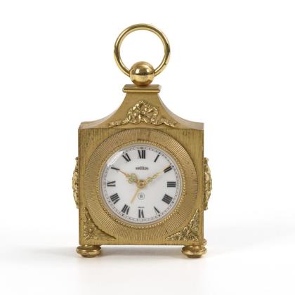 100+101: Kleine goldene Taschenuhr in antikisierendem Taschenuhrenständer.