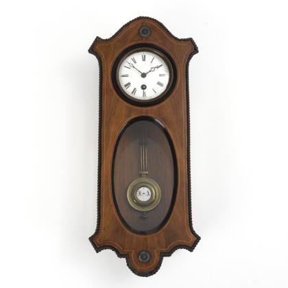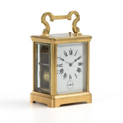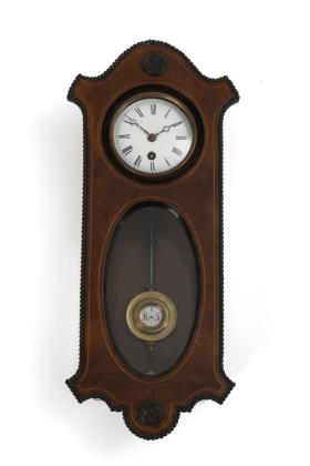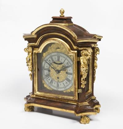 4-Seiten verglastes, an den Ecken geschrägtes Holzgehäuse mit figürlichen und ornamentalen Applikationen, partiell gold gefasst. Ornamental gravierte Messingblech-Front, im Bogen Ausschnitt für das Scheinpendel, silberner Ziffernring mit gravierten schwarzen römischen und arabischen Zahlen. Spindelhemmung, Viertelstundenschlag auf zwei Glocken, Hinterpendel, Schlüsselaufzug