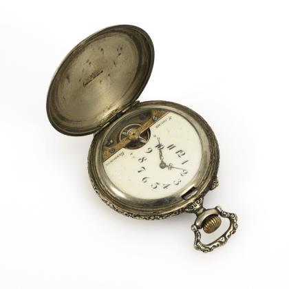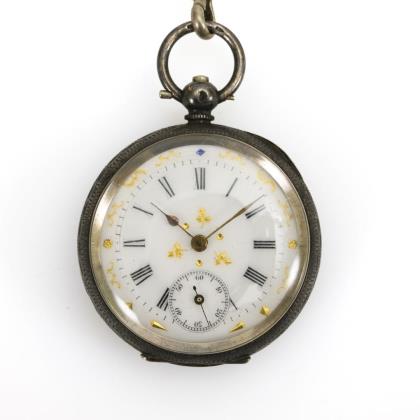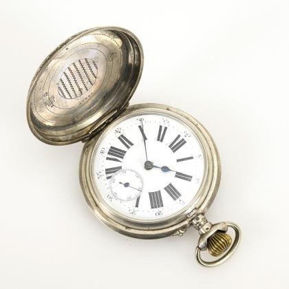 Savonnette with chessboard decoration and floral relief rim, gilt dust cover engraved "Willi Hartmann". Comes with a watch fob with black fabric and gold-plated decorative element
