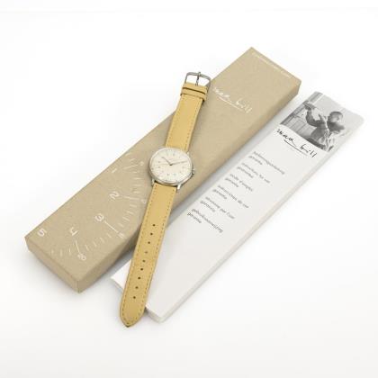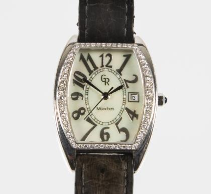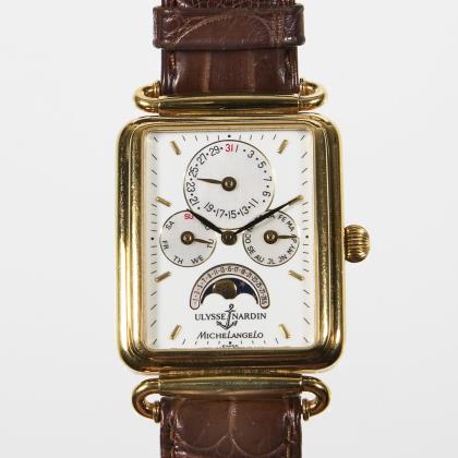 Automatikwerk, 19 Steine, Kaliber 16-5, water-resistant. Verglaster Boden, 4-fach verschraubt, seitlich Korrekturdrücker, Saphirglas, weißes Zifferblatt mit Perlmutt-Einlagen, Hilfszifferblätter für Datum, Wochentag, Monat, Mondphase. Bewegliche Bandanstöße, Original-Lederband mit Dornschließe, Korrekturstift