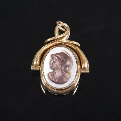 Perlmutt-Kamee, rückseitig Moosachat-Tafel. Ohne Punzen, Feingehalt mit Säure geprüft