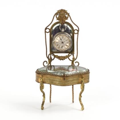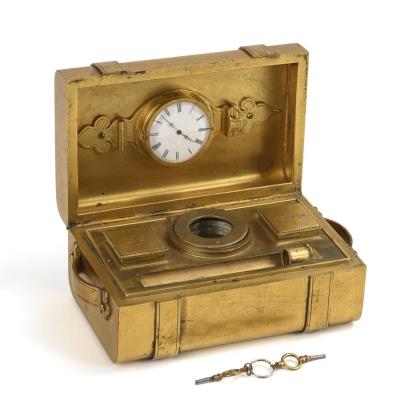 Seltene Schreibtischzeug in Form eines Koffers mit kleiner Taschenuhr.