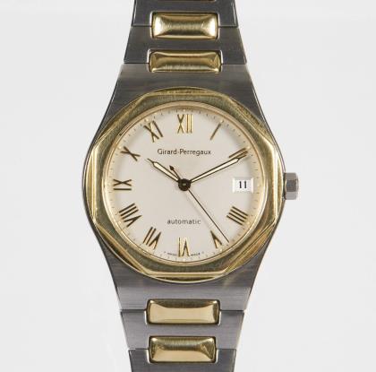 Automatikwerk, water-resistant bis 100 Meter. Zifferblatt mit applizierten goldenen römischen Zahlen, Datum-Fenster, große Sekunde, Zeiger mit Leuchtmasse, Original-Armband mit Doppelfaltschließe. Original-Box, Karton, drei Broschüren mit Gebrauchsanweisung, Garantieheft