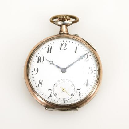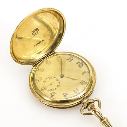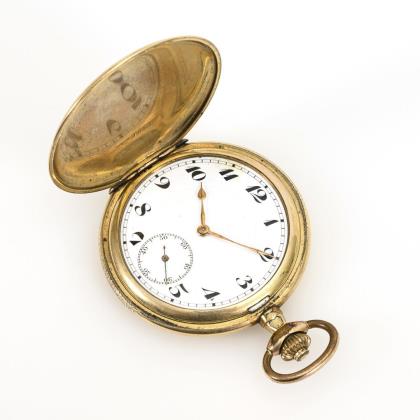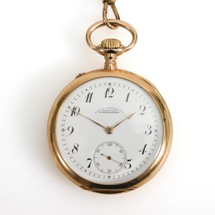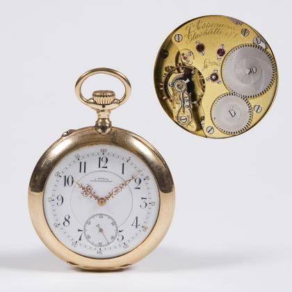 Glattes Gehäuse mit graviertem Monogramm, Gold-Innendeckel. Zifferblatt, Gehäuse und Werk signiert. Dreiviertel-Platinen-Ankerwerk mit Schwanenhals-Feinregulierung, Diamant-Deckstein, vier verschraubte Chatons. Weißes Emailzifferblatt, arabische Zahlen, kleine Sekunde, durchbrochen gearbeitete Zeiger. Kronenaufzug