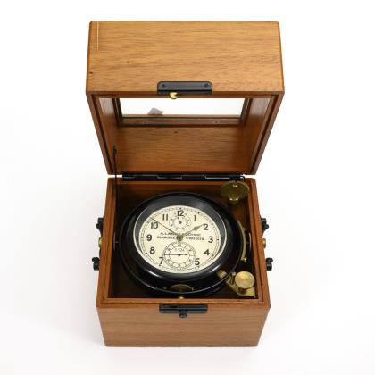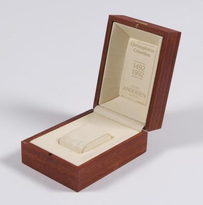 Für Weltzeituhr Christophorus Columbus 1992, limitiert auf 500 Exemplare. Karton mit Goldprägung, Holz-Box mit Messing-Plakette und Daumendrücker, helles Innenleben, im Deckel Goldprägung