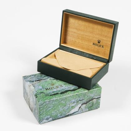 Rolex Oyster-Karton, grüne Leder-Box mit Holzkern, am Boden Schriftzug 68.00.55 Montres Rolex S.A. Genéve zwischen zwei Rolex-Kronen in Goldprägung. Innen-Ausstattung in hellem Velour. Dabei grünes Leder-Etui mit goldener Krone, Rolex Oyster-Garantieheft