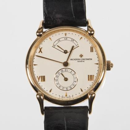 Automatikwerk, Kaliber 1190, Gangdauer 39 Stunden. Zifferblatt mit applizierten römischen Goldzahlen und Strichmarkierungen, Goldzeiger, Hilfszifferblätter für Gangreserve und Datum. Original-Lederband mit 750er Gelbgold-Dornschließe