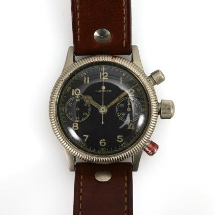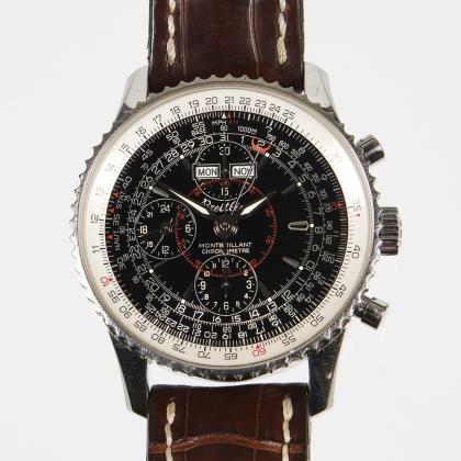 Chronograph, Chronometer, Vollkalender, Automatikwerk. Schwarzes Zfferblatt, Fenster für Wochentag und Monat, Zeigerdatum, Zeiger mit Leuchtmasse, applizierte Strichmarkierungen, geriffelte drehbare Lünette mit Rechenschieber-Funktion. Neutrales Lederband mit Dornschließe