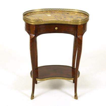 Kidney-shaped side table in transitional style on 4 slightly curved legs, with pedestal shelf, drawer and yellow-red-blue marble top (Brèche Jaune); decorated with diamond marquetry, brass gallery and applications