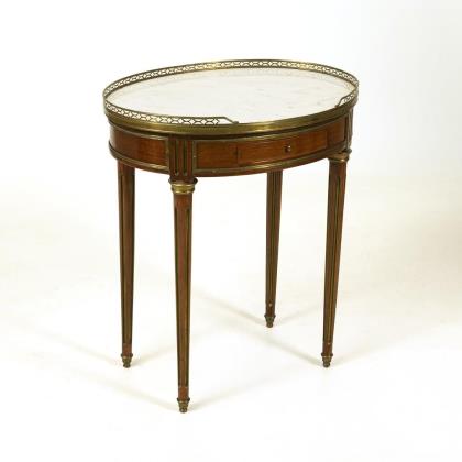 Oval side table on 4 conical legs with brass-fitted fluting and top in white, veined gray marble, framed by a perforated brass gallery, smooth frame with drawer slide