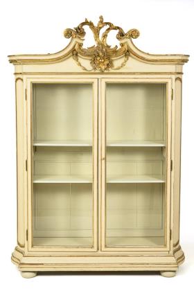 2-door showcase cabinet in a curved shape typical of the style, split pediment with lavish rocaille carving, on flattened ball feet; 2 shelves inside