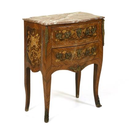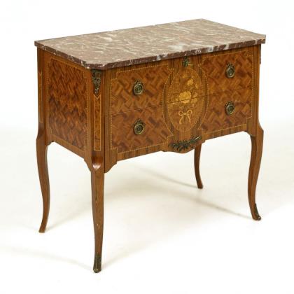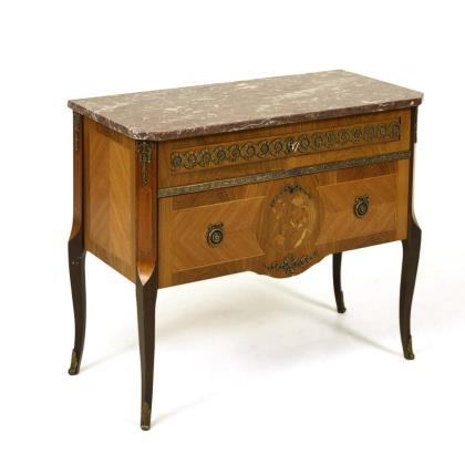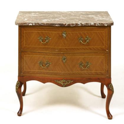 Kleine zweischübige Kommode mit rötlicher Marmorplatte.