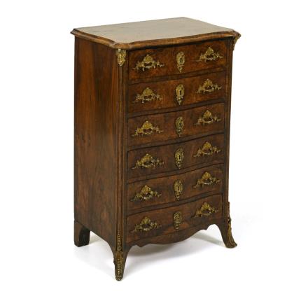 Chest of drawers with 3-drawer base and beveled writing flap with pull-out supports, on curved feet; decorated with mirrored burl veneer and bronze fittings; simple furnishings with 7 drawers and 3 open shelves