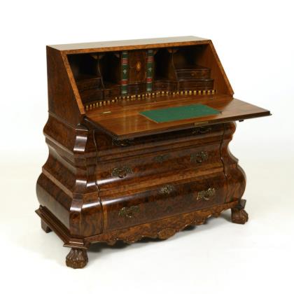 Chest of drawers in a strikingly curved shape with a 3-shelf chest base and beveled writing flap, on "claw-and-ball" feet typical of the style; decorated with burl veneer and bronze fittings; beautiful interior with 2 sliding compartments in book spine form, curved drawers, open shelves and 1 sunken compartment, writing top can be supported and with green velvet cover