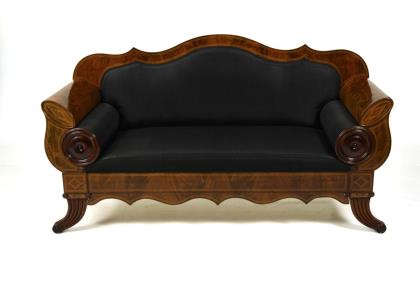 Fully upholstered seat for 3 people with curved backrest and frame, voluted feet with grooved decoration and armrests in horn-of-fill design, indented side castors typical of the style; decorated with burl veneer and ribbon inlays, black horsehair cover