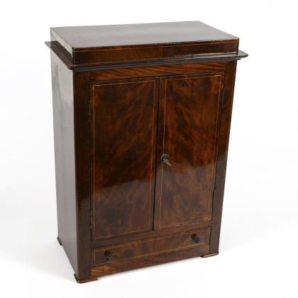 2-door doll's or model cabinet with plinth drawer, decorated with burl veneer and fine ribbon inlays in lemon wood; 2 shelves inside