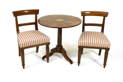 Kleiner runder Biedermeier-Salontisch und 2 Stühle mit gestreiftem Sitz.