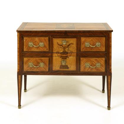 2-tier chest of drawers on 4 tapering pillar legs, decorated with mirrored rosewood veneer, floral marquetry and bronze applications