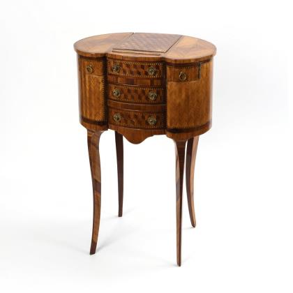 Sophisticated, kidney-shaped ladies' furniture on 4 sabre legs with an openable reading or writing desk, 2 small side compartments for utensils and 2 small central drawers, 2 concealed secret compartments behind the drawers, top panel with integrated compartment under the desk top; richly decorated with cube marquetry and herringbone marquetry on all sides
