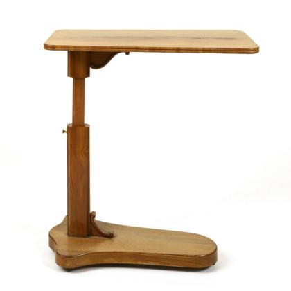 Rollable, narrow table that can be positioned at the side of a bed to make reading, writing or eating easier. Rectangular table top on side pillar support and base, individually height-adjustable up to 95 cm