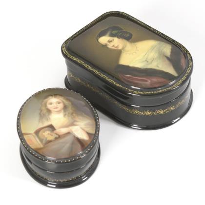 Painted on the hinged lids: Oblong box with finely painted Biedermeier lady; oval box with portrait of a girl