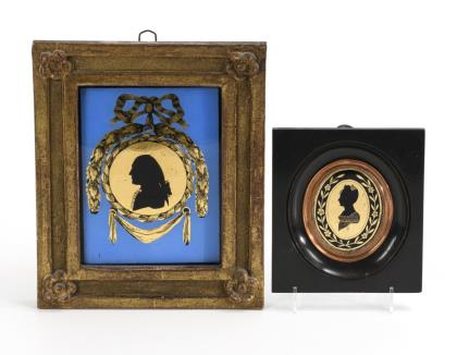 Black silhouette portraits similar to silhouettes on a gold background with framing in the same technique: portrait tondo of a young man in an elaborate Louis Seize frame against a blue background in the original gold stucco frame and oval portrait of a young woman in a wreath frame in an ebonized frame with a profiled copper inner border