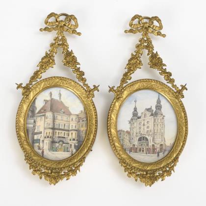 Finely painted views of the magnificent "Regensburger Hof" department store in Vienna by the same hand; 1x before the demolition in 1897 and 1x after the new construction. Richly decorated frames with floral reliefs and garland/ribbon crowning