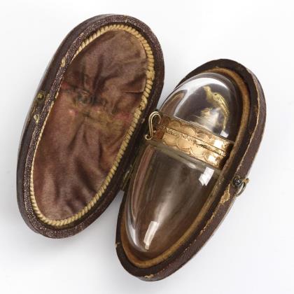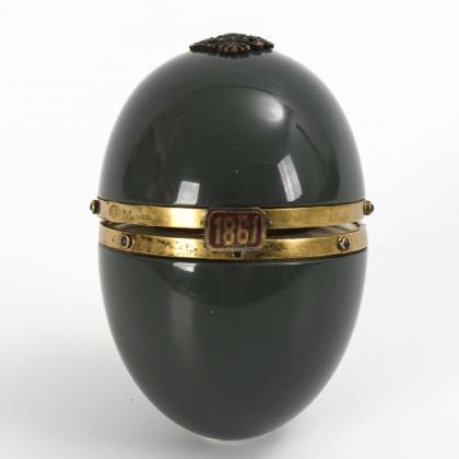 Ovoid glass flacon with hinged lid and finely engraved mounting; inner stopper with bird figure