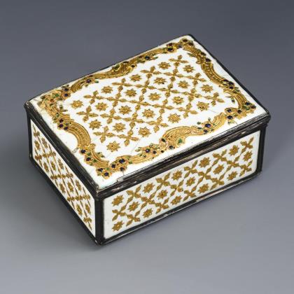 Cuboid tabatiere with À-Cage mounting. Decorated on all sides and on the base with a star/rosette repeat; additional rocaille framing with translucent enamel trim on the hinged lid. White enamel inside