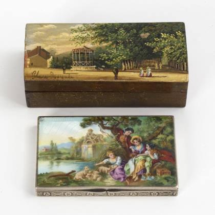 2 Tabatieren 19. Jh - 1 x Emaille, mit Einfuhrstempel 1840-70, als Zugabe Holztabatiere mit Pavillon.