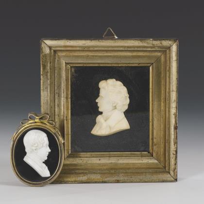 2 Biedermeier portrait reliefs, one in a gilded silver frame.