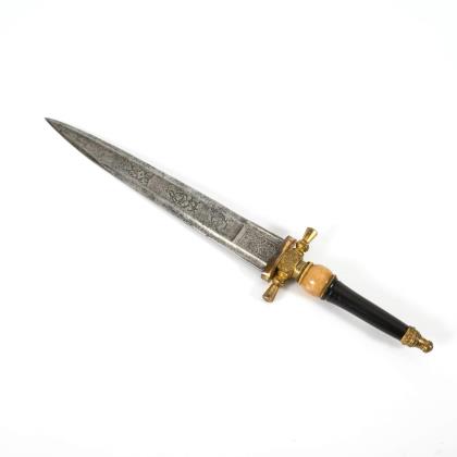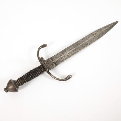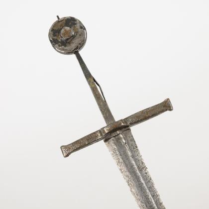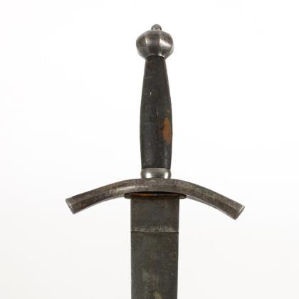 Kleiner Degen für Kürassieroffiziere. Preußen. Klinge L 83 cm, Gesamt L 99 cm. Auch als Kürassier-Offizier-Interimsdegen bezeichnet. Gerade einschneidige Klinge, im ersten Drittel gebläut und graviert mit Resten von Vergoldung, "I.G.B." Drei gewollte Kerben in der Nähe des Griffes. Herzförmiges, leicht gewölbtes Stichblatt mit Muschelende, gerade Parierstange, durch ein Ende des Stichblattes ragend. Kugelknauf mit Siegelplatte. Griff aus feiner Drahtwicklung, wohl ursprünglich überzogen. Schwarze Lederscheide mit fehlender Spitzenhülse. Literatur : Maier: Preuß. Blankwaffen, S. 146.