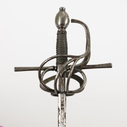 Gerade, reich geätzte Klinge "Eisenhauer Damaststahl", mit Resten von Vergoldung. Ovales Stichblatt und vierspangiger Korb. Krone am Knaufende später montiert. Lederschlaufe für Daumen und Portepee. Blanke Metallscheide mit zwei Trageringen und Reparaturspuren und Gehänge