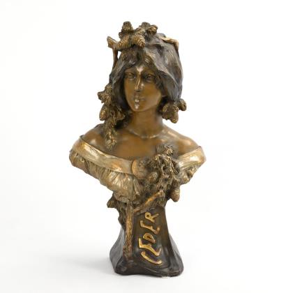 ''Ceder'' F.P. Kowalzewski (Entwurf), Fritz Kochendörfer, Herzynia-Manufaktur, Osterode (Harz), um 1900 Büste einer jungen Dame mit Zederzweig. Terrakotta, in Braun-, Bronze- und Goldtönen staffiert. F.P. Kowalzewski (geritzt), FRITZ KOCHENDÖRFER, 576, 17, 8 (eingestempelt). H. 64 cm
