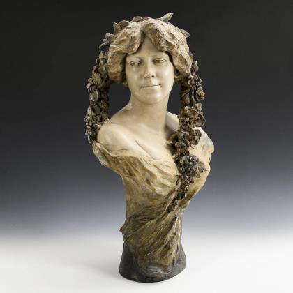 Büste - Frau mit Blumengirlande Cherc (Entwurf), Friedrich Goldscheider, Wien, um 1903 Terrakotta, farbig staffiert. Bez.: Cherc (geritzt), Firmenmarke Sculpture, REPRODUCTION RESERVÉE, Modellnr. 2671. H. 65 cm Lit.: R.E. Dechant/F. Goldscheider, Goldscheider, S. 364