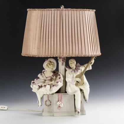 Table lamp with ceramic figures: Harlequin and Colombine. Viennese enamel paint factory Schauer & Co.