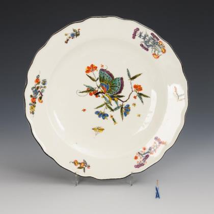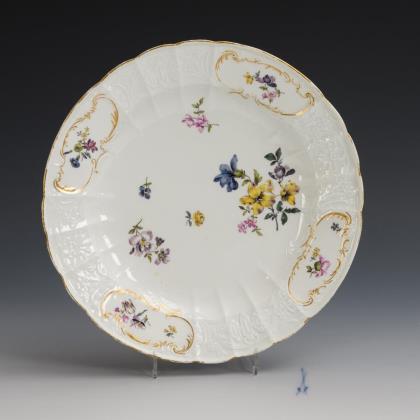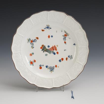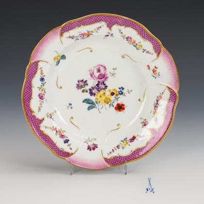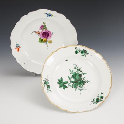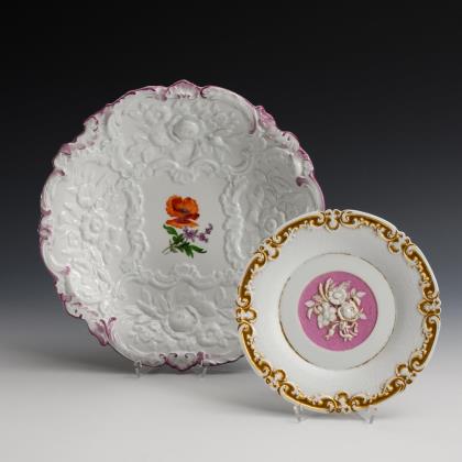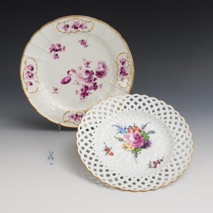 1x Schwertermarke mit Stern, Marcolini-Zeit, 1774-1814: Teller mit korbdurchbrochener Fahne und einem polychromen Blumenbukett (Ø 23,5 cm). / 1x Schwertermarke, um 1750: Teller Form "Dulong" mit purpurfarben gemalten Blumenbuketts