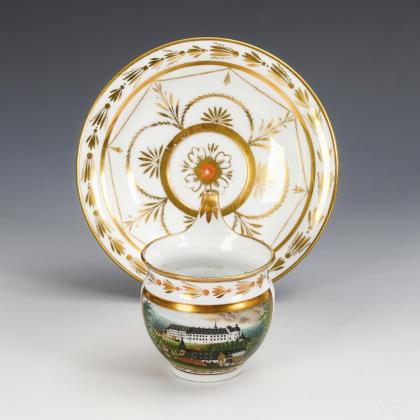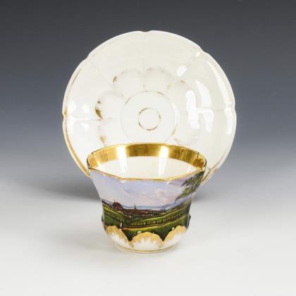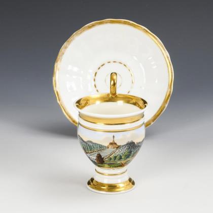 Splendid cup with rocaille relief and handle. In the rocaille cartouches the depiction of landscapes with peasants, inside gilded