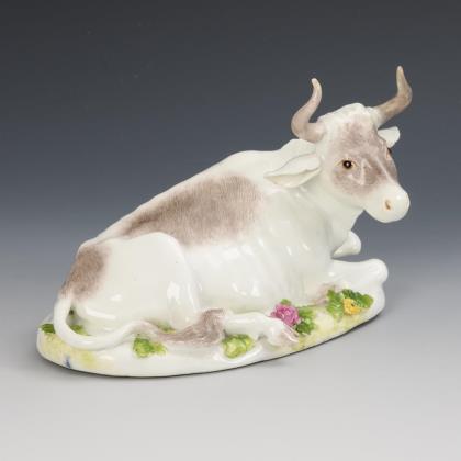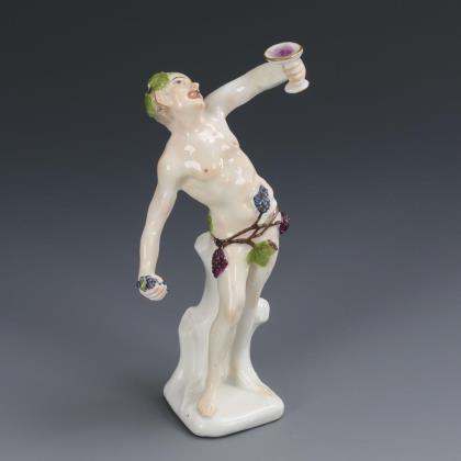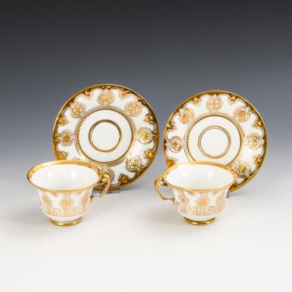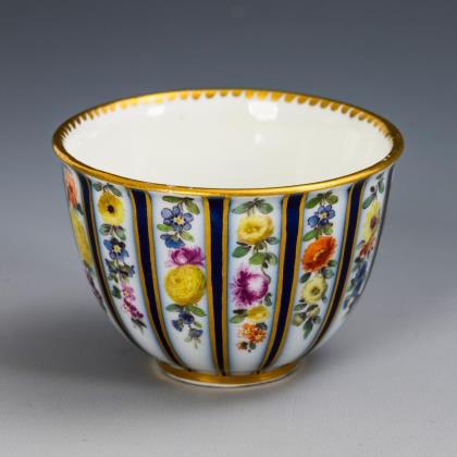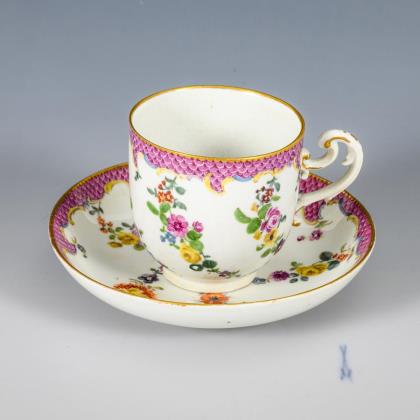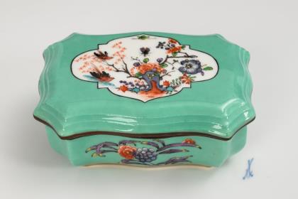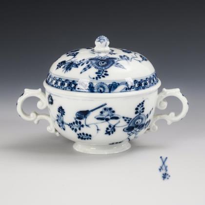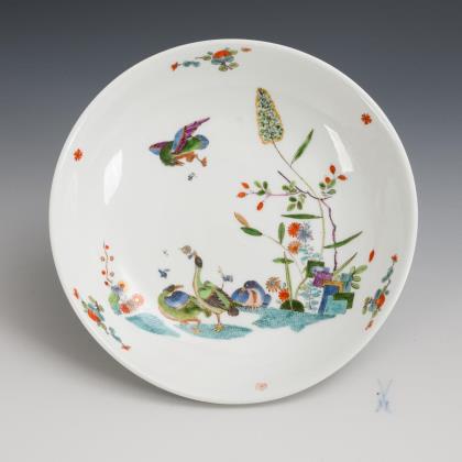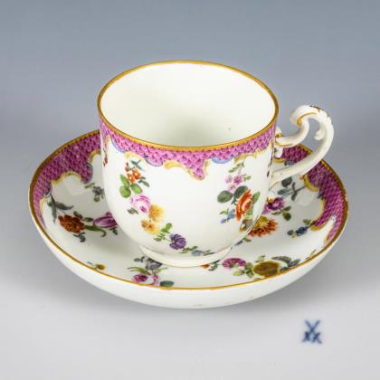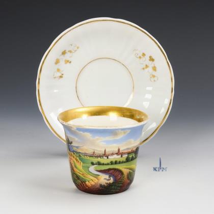 Auf den Außenwandungen "Weinrebenrelief mit Trauben" in dreifachem Rapport über zitronengelbem Fond. Im Spiegel feine farbige Bemalung mit "Kauffahrtei-Szene" und "Blumenbukett", goldene Zahnkanten, Goldstaffage. Pressmarken, Schwertermarken mit Punkt