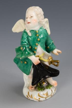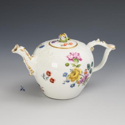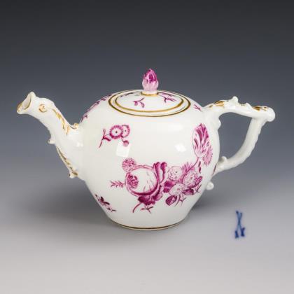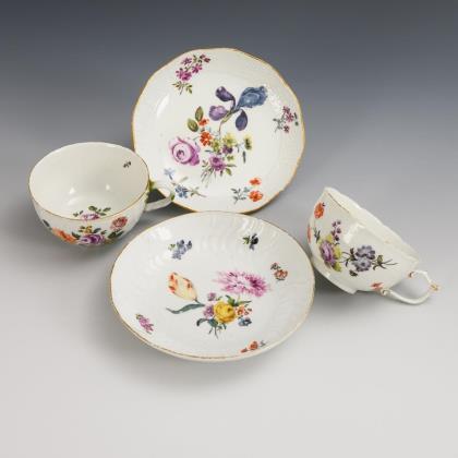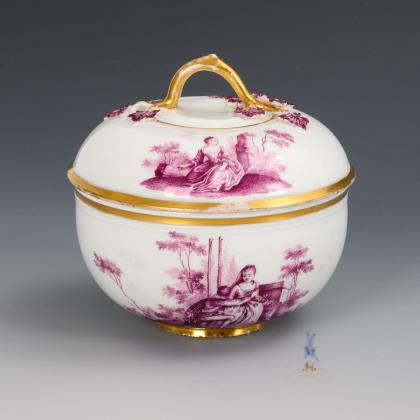 All with finely painted depiction of gallant couples in park landscapes. Pear cup with rocaille handle, finial and flower knob lid (h 14,5 cm), tea caddy (without lid; h 10,5 cm), 2 coffee cups with rocaille handle (h 7 cm) and original saucers (Ø 13,5 cm), 4 bulbous cups with ear handles (h 4,5 cm) and original saucers (Ø 12 cm) and 1 quatrefoil bowl (l 17,5 cm)