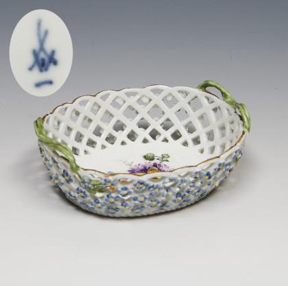Die durchbrochen gearbeitete Wandung mit aufgelegten kleinen blau-gelb staffierten Vergißmeinnicht-Blüten, seitlich zwei Ast-Handhaben, innen farbige florale Bemalung, gold staffierter Rand. Schwertermarke mit Punkt