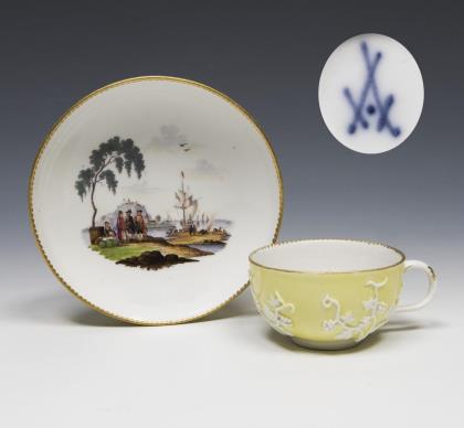 Baroque cup, saucer with yellow background and relief. Meissen.