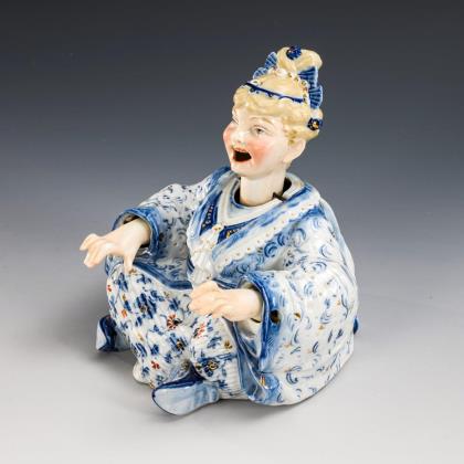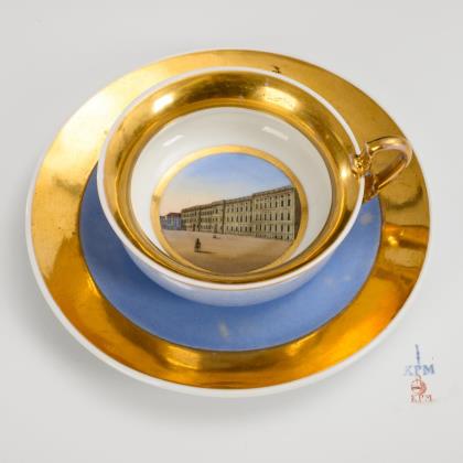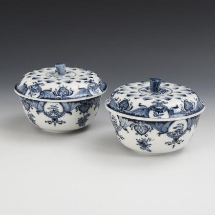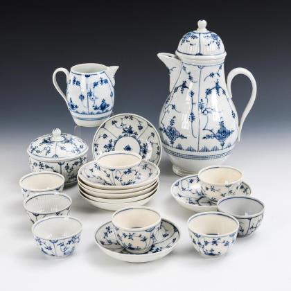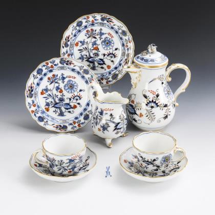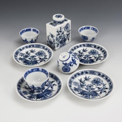 Teekännchen, Milchkännchen, Zuckerdose, 2 Tassen, 2 Untertassen. Reliefdekor "Gebrochener Stab", kobaltblaue Unterglasurmalerei, korallenrot und gold staffiert, "Vogel-Blumen-Dekor". Ritzmarken, Bodenmarken