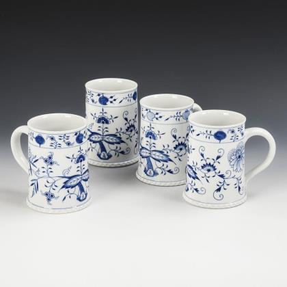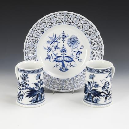 2 onion pattern beer mugs and 1 pierced plate. Meissen.