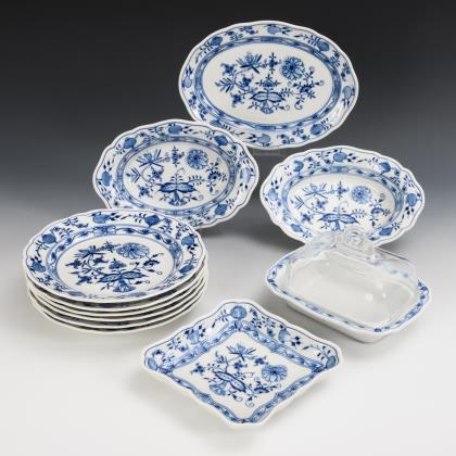 Onion pattern bread basket and 10 openwork plates. Meissen.