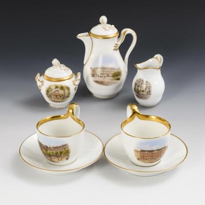 Shape "New cutout". Coffee pot (h 25,5 cm), 1 sugar bowl, 14 cups, 12 saucers (Ø 10x 13,5 cm and 2x 14 cm), 6 egg cups and 2 different salvers (1x Ø 5 cm and 1x L 11,5 cm)