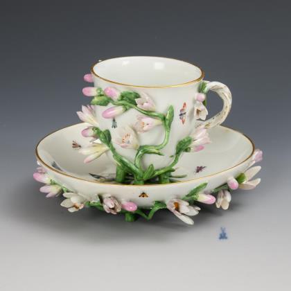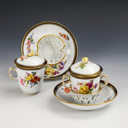 Doppelhenkeltassen mit Rosenknaufdeckel sowie Untertassen mit durchbrochenem Standring