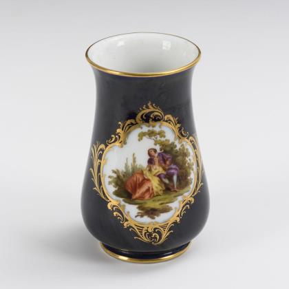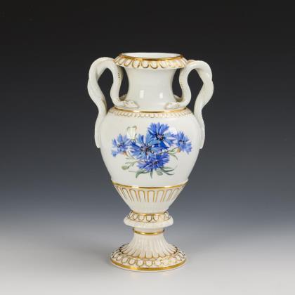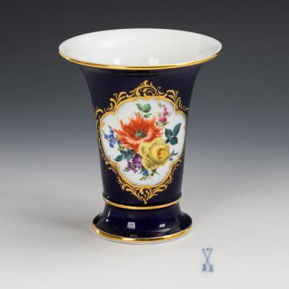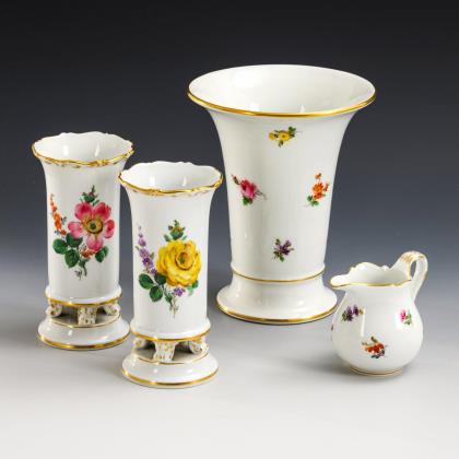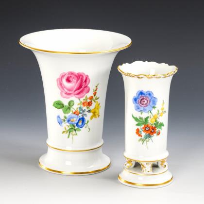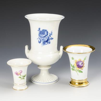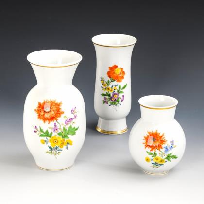 Modell von Ernst August Leuteritz und Mitarbeiter 1863-1865. Geschweifte Goldreserven mit farbig gemalten Blumenbuketts, eine Vase mit Goldspitzenbordüre, beidseits bemalt. Eine Vase fontal bemalt. Ritzmarke, Pressmarken, Schwertermarken