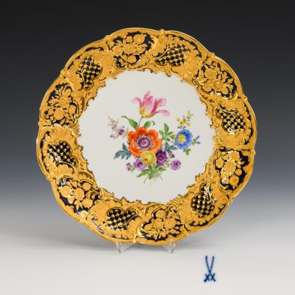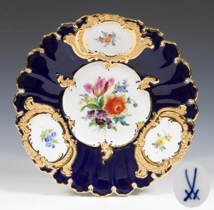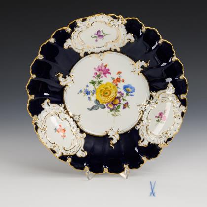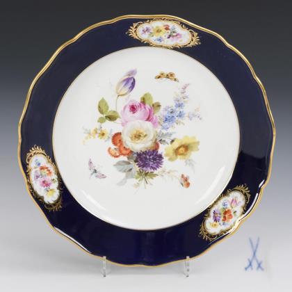 Plate with cobalt rim and flower painting. Meissen.